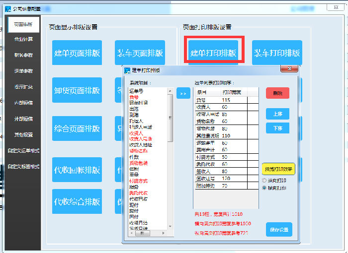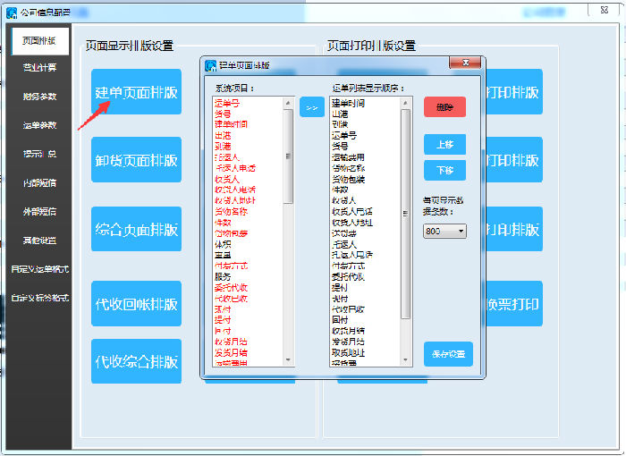 点击建单打印排版之后弹出对话框如下图。同样,在系统项目里面双击变为红色的选项,在运单列表打印顺序里面能查看到,即表示选择成功,点击保存设置即可。