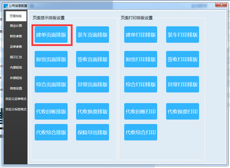 进入公司配置之后看到的画面如下图,在页面排版选项里面就能看到页面显示排版设置和页面打印排版设置,举例说明建单页面排版功能,其他排版功能设置方法都相同,只是设置的内容不同,如下图:点击建单页面排版
