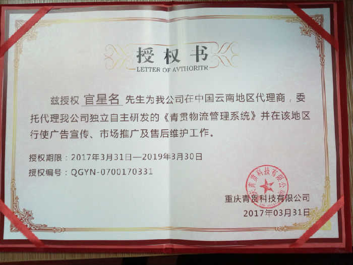 我公司授予俊捷物流官星名先生为中国云南地区代理商!